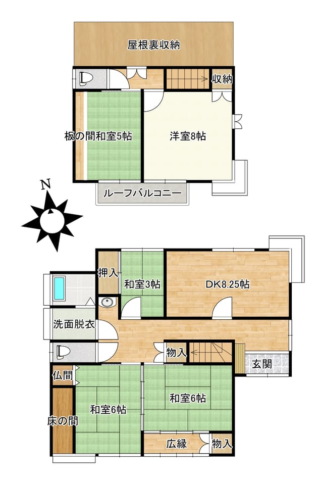 | 間取 | 5DK(1階DK7.5帖、和室6帖×2、3帖 2階洋室8帖、和室6帖) |