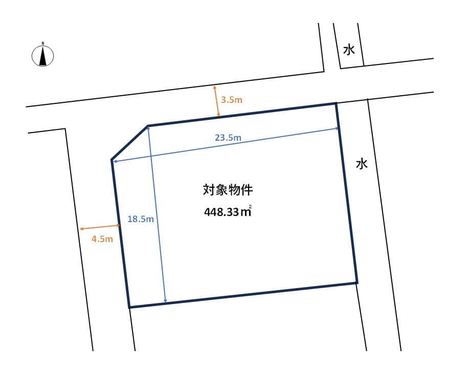 | 接道状況 | 方角:北 道路幅員:3.5m 公私区分:公道 接面:23.5m 方角:西 道路幅員:4.5m 公私区分:公道 接面:18.5m |