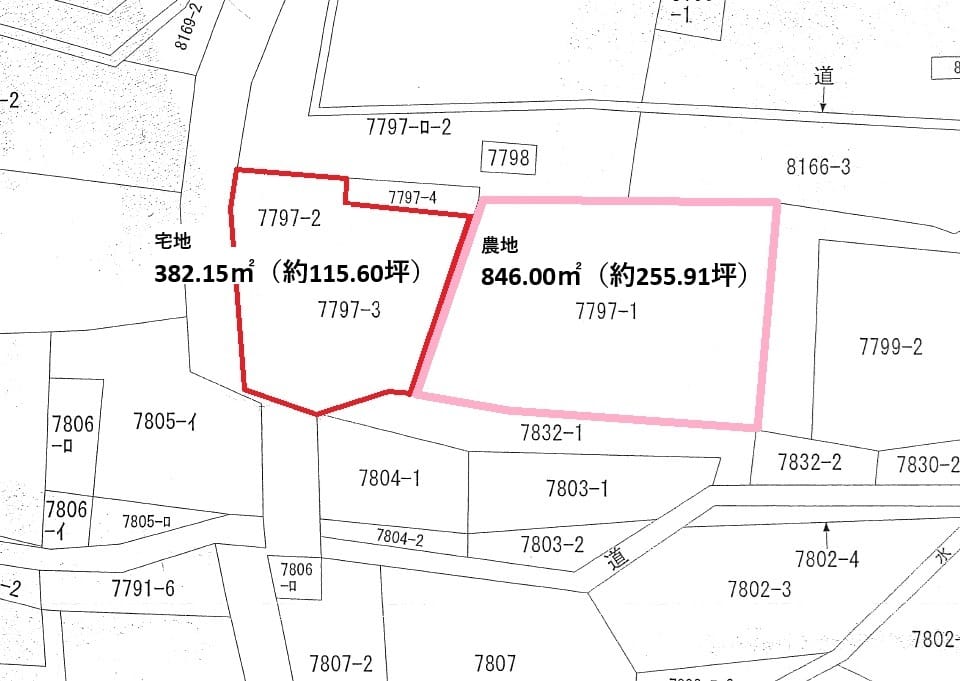 宅地部分382.15㎡(約115.60坪)、農地部分846.00㎡(約255.91坪)