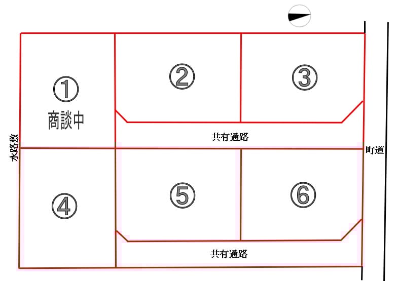 | 接道状況 | 方角:北 道路幅員:2m 公私区分:公道 接面:23m 方角:東 道路幅員:3.5m 公私区分:公道 接面:56m |