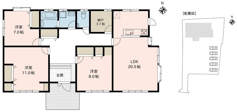 - 間取3SLDK(LDK20.5帖、洋室11帖、洋室8帖、洋室7帖、納戸3.1帖)