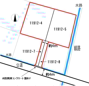 備考 | 浸水想定区域(想定最大規模0.5m未満) 農地法、景観法、文化財保護法 農地転用・農地転用計画変更 要 敷地内に電柱と控え線 有 私道部分に上水道配管(隣家と共有使用)埋設 有 上水道加入金 100,000円 下水道負担金 550,000円 |