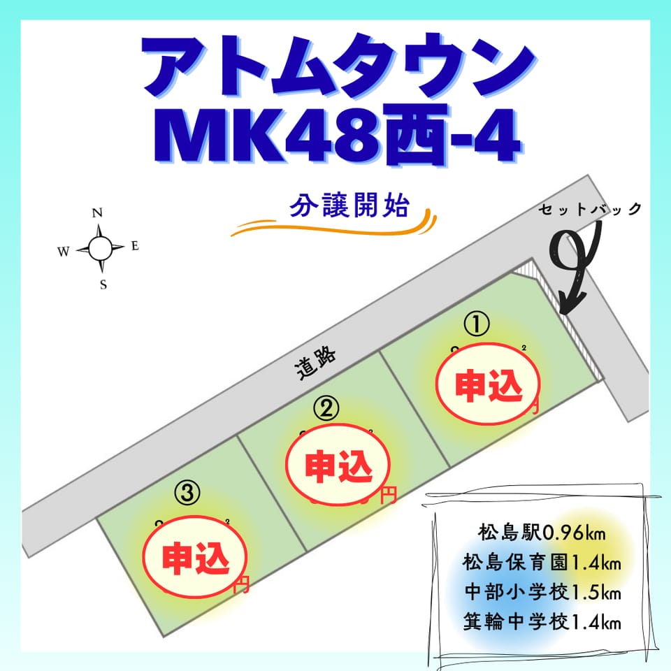 保育園からとても近く、風に乗って子供達の楽しい声がそっと聞こえてきます。役場に近い事から災害など少なく安全な立地で、日当たりも良く穏やかです。前面に道路が走っていますが、交通量も少ないです。物件から右に出れば春日街道や農道。左に出れば国道やバイパスがありアクセスがとても良いです。