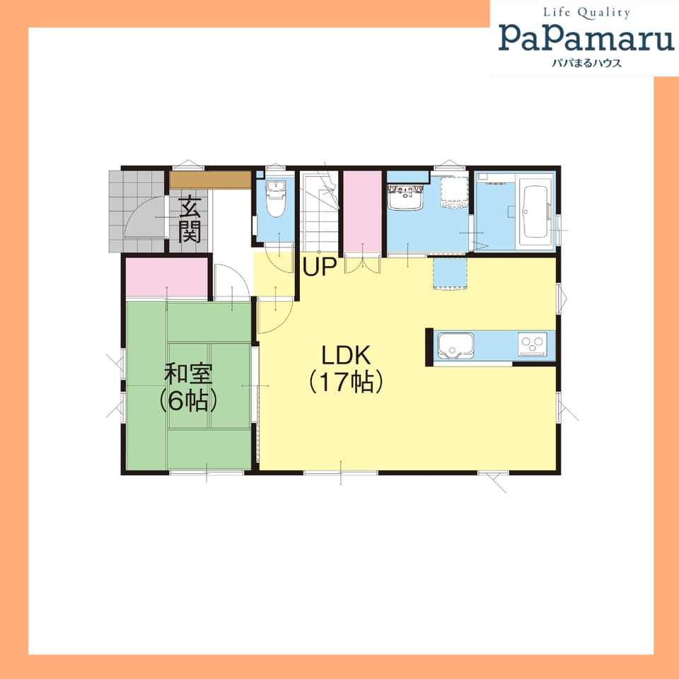 玄関から快適!全館空調「Z空調」搭載の4LDKプランで、1階は17帖のリビングと6帖の和室で広々と使えます。